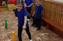 Сегодня на физкультуре проделывали упражнене "Бег , не сбивая кеглю". Все дети справились с заданием.