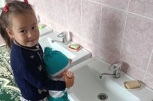 «-Посмотри, какие у куклы грязные руки, что же ей надо сделать?». Азалия объясняет, что надо вымыть руки. Вместе с воспитательницей осматривает необходимые предметы: таз, мыло, полотенце. Воспитатель задает вопросы о каждом предмете, о его назначении, показывает последовательную цепочку действий: засучить рукава, намочить руки кукле и мыло в тазике, затем намылить руки и сполоснуть их водой, положить мыло в мыльницу, еще раз хорошо промыть руки водой и вытереть полотенцем. При этом взрослый читает стихотворение: