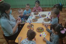 Учить детей располагать узор по краю круга, правильно чередуя фигуры по величине; составлять узор в определенной последовательности: вверху, внизу, справа, слева-большие круги, а между ними-маленькие.