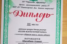 Безнең тәрбияләнүчебез диплом алды өченче урын өчен район конкурсында!
