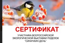 Сертификат Участника Всероссийской экологической выставки поделок "Синичкин день" 14.11.2022