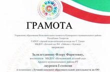 Туган телдә белем һәм тәрбия бирү буенча иң яхшы конспект номинациясендә безнең тәрбиячегә Залялетдинова Флера Фаритовнага беренче дәрәҗә лауреатка Грамота бирелде