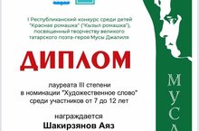 Бөек татар шагыйре-герой Муса Җәлил иҗатына багышланган балалар арасында беренче " Кызыл ромашка" республика конкурсында мәктәбебезнең 1 нче класс укучысы Шакирҗанов Аяз 3 нче дәрәҗә дипломга лаек булды.