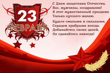 Уважаемые мужчины, поздравляем вас с Днем защитника Отечества! Желаем вам мирной жизни, без войн, потерь и трагедий. Пусть ваши силы растут, умения и навыки множатся, достижения превосходят все ожидания. Пусть окружающие радуют, семья дает силы и вдохновение, работа приносит желанные плоды. Мужества вам, силы духа и много удачи!