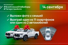 14 сентября, в день проведения выборов Раиса Татарстана и муниципальных депутатов пройдет фотоконкурс #ТатарстанАлга #ВсейСемьейНаВыборы. По его итогам можно выиграть автомобиль или смартфон