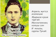 26 АПРЕЛЬ — ГАБДУЛЛА ТУКАЙ ТУГАН КӨН! Бүген бөек шагыйребез Габдулла Тукайның тууына 132 ел. Габдулла Тукай 1886 елның 26 апрелендә элекке Казан губернасы Мәңгәр волосте (ТАССР Арча районы) Кушлавыч авылында туа. Кечкенәдән ятим калган, балачагы гаять авыр һәм катлаулы узган Габдулла бик кыска гомерле була. Нибары 26 ел яшәп, 1913 елның 15 апрелендә гомере өзелә. Габдулла Тукай — татар шигъриятенең иң якты йолдызы. Шагыйрь калдырган иҗат мирасы — безнең мактанычыбыз һәм горурлыгыбыз. Тукай исән чакта ук болай дип язган: Дөньяда бик аз булыр чын шагыйрь, Габдулладай, Ул — караңгы төндә яктырткан матур, тулган ай. Ул — бөек уй, нечкә хис, тәгъризләргә бик бай, — диям. Бар урыннардан аның урыны кадерле, дәү, — диям. Бакыр өчендә көмешләр ялтырап яткан кебек, Ап-ачык, ап-ак булып, тик ак күңел аккан кебек. Габдулла Тукай татар халкының бөек шагыйре буларак бар җиһанга таралган. Аның күренекле “Шүрәле” һәм “Су анасын” кем генә укымаган да “ Туган телен” кем генә җырламаган икән? Туган тел И туган тел, и матур тел, әткәм-әнкәмнең теле! Дөньяда күп нәрсә белдем син туган тел аркылы. Иң элек бу тел белән әнкәм бишектә көйләгән, Аннары төннәр буе әбкәм хикәят сөйләгән. И туган тел! Һәрвакытта ярдәмең белән синең, Кечкенәдән аңлашылган шатлыгым, кайгым минем. И туган тел! Синдә булган иң элек кыйлган догам: Ярлыкагыл, дип, үзем һәм әткәм-әнкәмне, ходам!