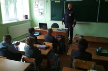Бүген бездә кунакта - ГАИ инспекторы Хәкимов Р.Р. Укучыларга юл йөрү кагыйдәләрен аңлатты, үзенең бүләкләрен өләште.