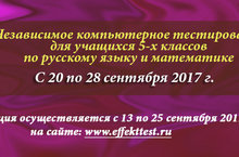 Независимое компьютерное тестирование для учащихся 5-х классов по русскому языку и математике проводится с 20 по 28 сентября 2017 года. Тестирование входит в перечень мероприятий инновационного Проекта «Независимая диагностика качества обучения школьников», реализуемого с 2015 года всероссийским научно-методическим журналом «УПРАВЛЕНИЕ КАЧЕСТВОМ ОБРАЗОВАНИЯ: теория и практика эффективного администрирования» совместно с Издательством «Эффектико-пресс». Техническим оператором проведения Тестирования является Центр независимых педагогических измерений «ЭффектТест».