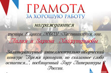 Объявлены результаты литературного интелектуального творческого конкурса "Время проходит, но сказанное слово остается..." посвященный Году Литературы в России. Грамотой за хорошую работу награждены ученицы 8 класса Лилия и Зарина Хайрутдиновы. Поздравляем!