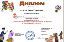 Ученик 5 класса Ахметов Раиль занял II место в I Всероссийской викторине по произведениям С.Я.Маршака (с международным участием). "Центр образования и воспитания" наградил его медалью и дипломом. Молодец!