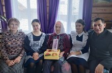 Тыл ветераннары Гыйльметдинова Нәкыя һәм Әхмәтҗанова Сабира апаларга, бәйрәм уңаеннан, Арча муниципаль районы башлыгы Нуриев Илшат Габделфәрт улы, җирлек башлыгы Котдусов Раушан Фарадис улы исеменнән котлау открыткасы, күчтәнәч тапшырдык.