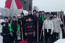 Хәрби-патриотик айлык башланып китте. 5-9 нчы сыйныф егетләре Ринат Бадгиев җитәкчелегендә һәйкәл янын кардан чистарттылар.