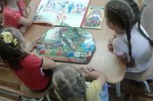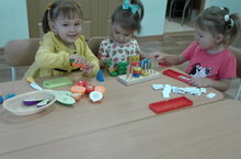 1 нче кечкенәләр төркемендә өстәл өсте уеннары. Балалар белән домино, геометрик фигуралар, яшелчәләр турау уеннары уйнау.