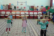 1) Подняли руки вверх! Вот как высоко! Опустили...2) Повернулись вправо-влево. Улыбнулись друг другу. 3) Наклонились, положили палку на пол, встали. 4) Положили палку на плечи и походили немного.