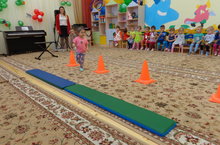 1 нче кечкенәләр төркеме. Максат: Балаларны конуслар арасыннан төрле юнәлештә дөрес итеп йөрергә өйрәтү. Гимнастик такталарда тезләнеп йөрү, колоннада атлау һәм йөгерү күнекмәләрен ныгыту. Игътибарлылык һәм мөстәкыйльлек тәрбияләү.