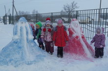 Суыктан, җилдән куркып тормадык, бакча территориясен матурладык: кардан сыннар ясадык.