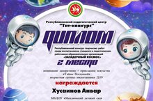 Награждается Хусаинов А, воспитанник нашего детского сада, в республиканском конкурсе творческих работ, в номинации декоративно-прикладное искусство "Тайны Вселенной". Поздравляем!!!