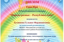Музыкальный руководитель нашего детского сада Хусаинова Гульшат Фердинантовна заняла почетное место - Гран-при во II Республиканском конкурсе "Народы разные - Республика одна!". Поздравляем и желаем дальнейших побед.
