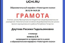 2 нче класс укучылары 20 нче декабрьдән 14 нче январьга кадәрле аралыкта Учи ру сайтында оештырылган “ Яңа ел әкияте” исемендәге марафонда катнашып мәктәп күләмендә беренче урынга чыктылар һәм грамота белән бүләкләнделәр. Укучылар бу сайтта дәрес вакытында да , өйдә дә бик теләп даими шөгыльләнәләр. -
