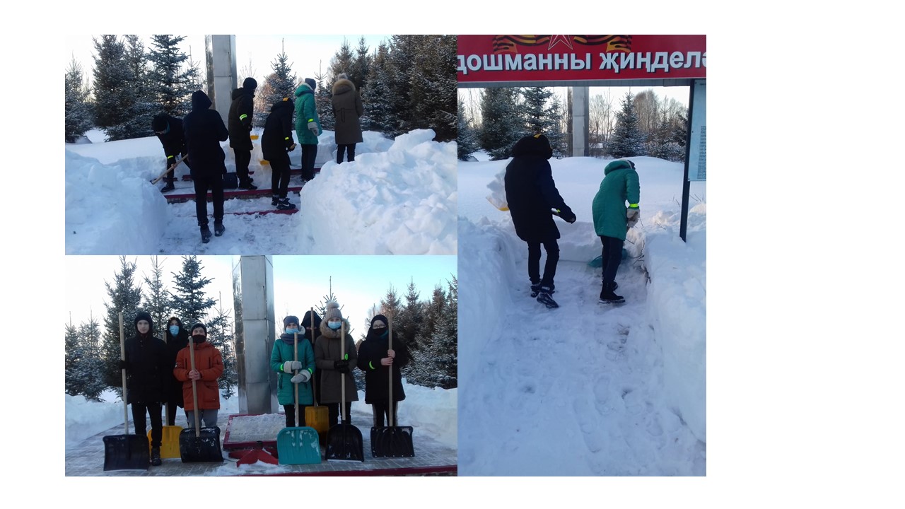 Бүген, 3 нче февраль көнне 8 нче сыйныф укучылары сыйныф җитәкчесе Маликова Г.Г. җитәкчелегендә, Бөек Ватан сугышында һәлак булган авылдашларыбыз истәлегенә куелган һәйкәлне кардан чистарттылар.