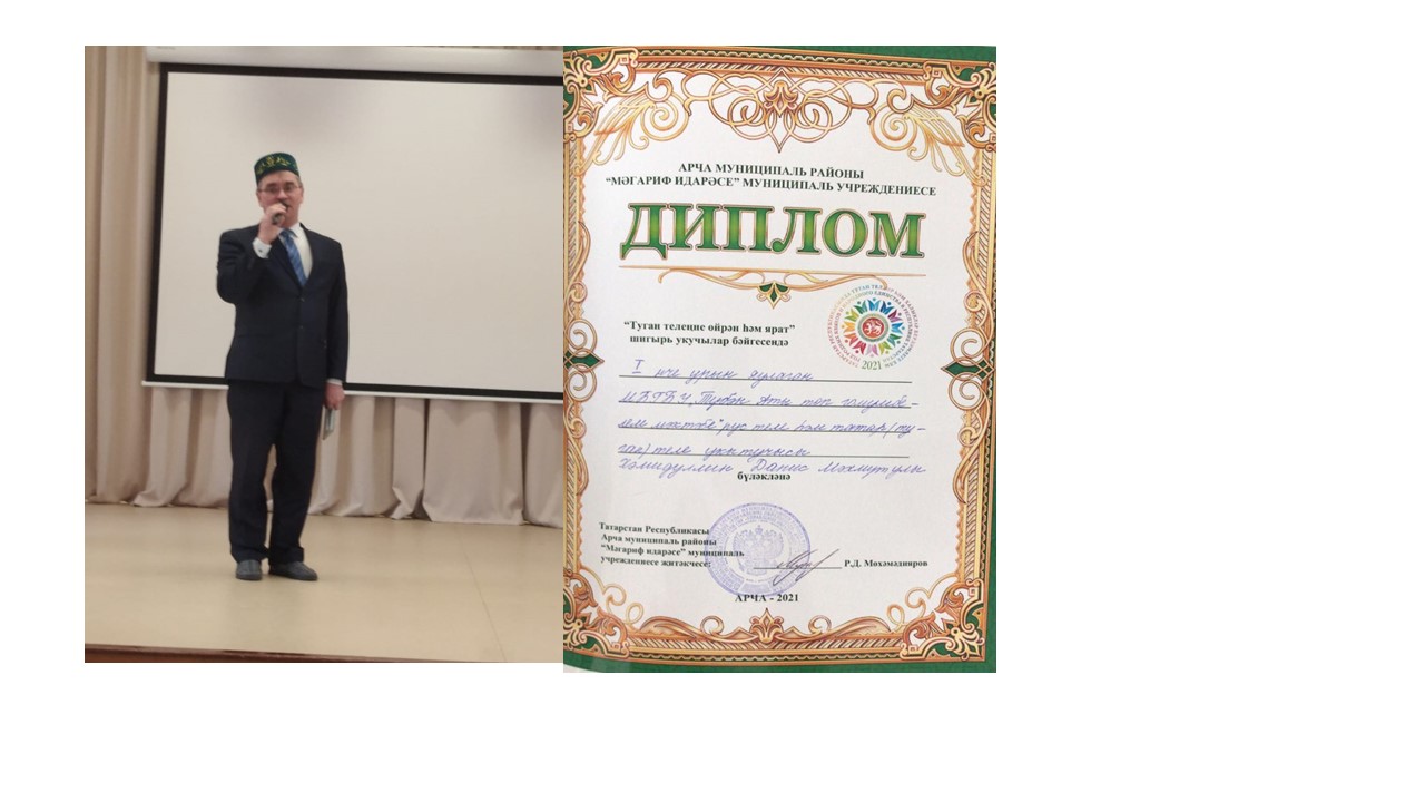 19 февраля на базе МБОУ «Арская СОШ № 6» Арского муниципального района был проведен конкурс чтецов «люби и изучай родной язык». На этом конкурсе успешно выступил учитель русского и родного языка нашей школы Хамидуллин Д. М. Он награжден Дипломом . Желаем Данису Махмутовичу здоровья, больших успехов в работе.