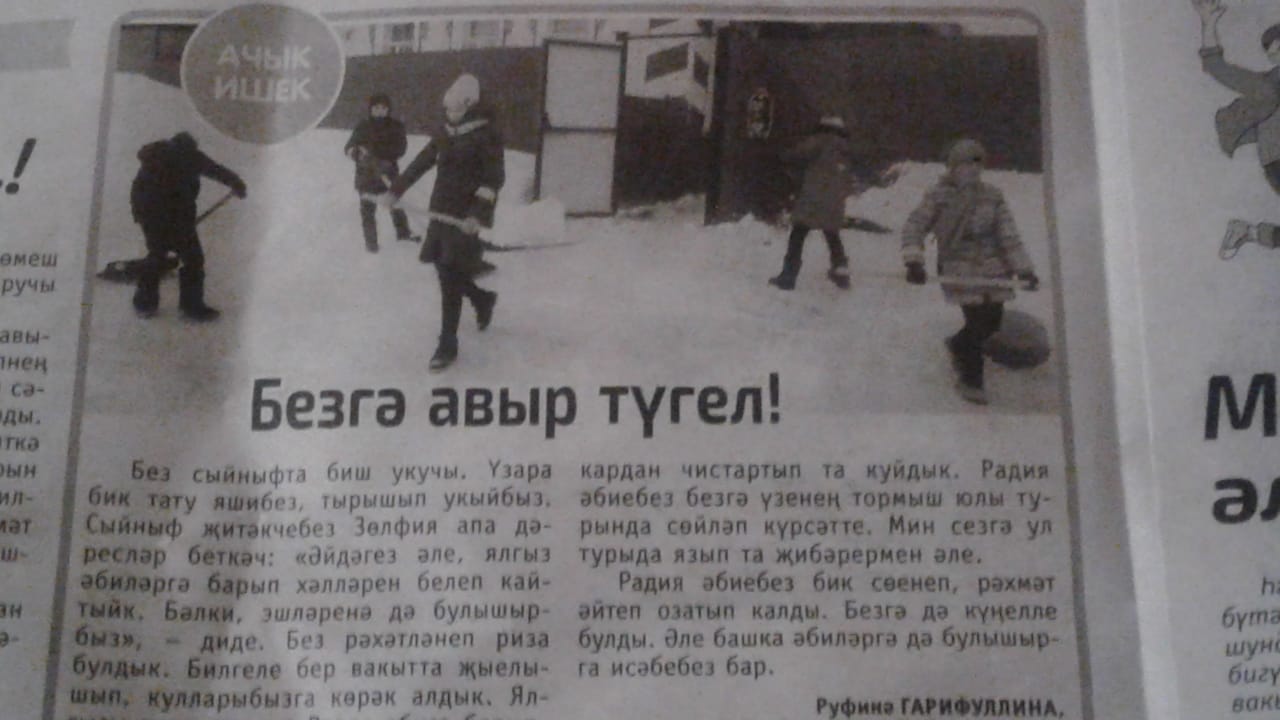 “Көмеш кыңгырау “газетасының 6 нчы март саныннан мәктәбебезнең 6 нчы сыйныф укучысы Гарифуллина Руфинәнең язмасын укыдык.Волонтёрлар хәрәкәте турында гел ишетеп торабыз.Үзебез дә ялгыз яшәүче әби-бабайларга теләп булышабыз.Әлеге мәкаләдә Радия әбигә ярдәм итүебез турында язылган.Сыйныфыбыз белән кар көрәгән фотобыз да урнаштырылган.Башкалар да бездән үрнәк алыр,башка әбиләргә дә язгы эшләрдә ярдәм итәрбез әле.