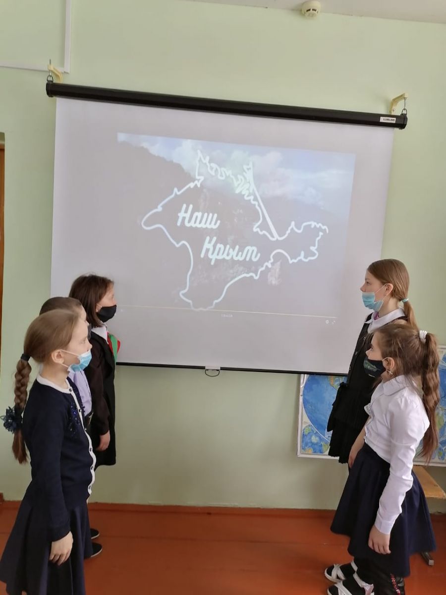 Кырымның яңадан Россия составына кушылу көнен билгеләп үтү максатыннан башлангыч класс укучылары белән класс сәгатьләре үткәрелде.Укучыларга видеороликлар күрсәтү барышында тарихи мәгълуматлар бирелде.