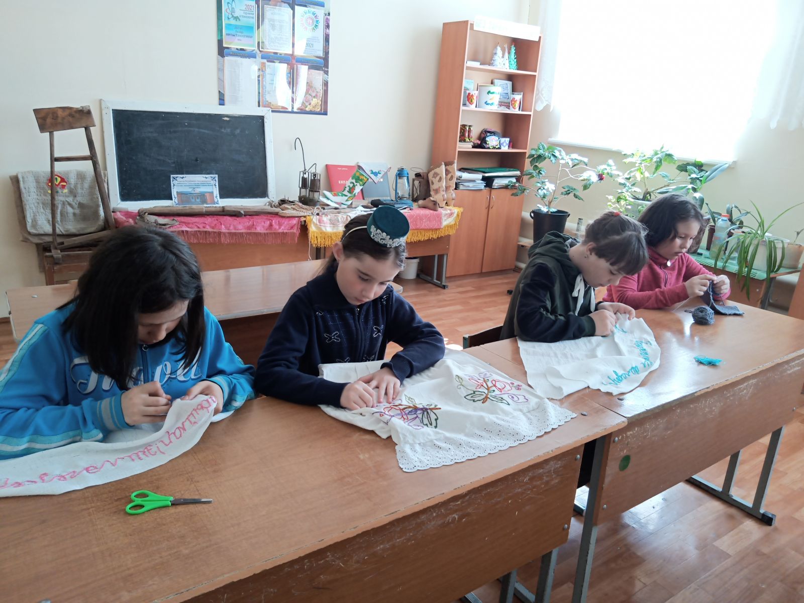 Каникул көннәрен файдалы да,күңелле дә үткәрергә тырышабыз.Китапханәдә, клубта,мәктәптә булган төрле чараларда да катнашырга тырышабыз.6 нчы сыйныф кызлары каникул көннәрендә милли чигү күнекмәләрен арттырырга уйладылар.Һәрбер кыз үзе ятлаган шигырьнең берничә юлын тукымага төшерә башладылар.Бергә сөйләшә-сөйләшә эшләве барыбызга да ошый.Бөек Тукай иҗатын кабатларга җае да чыгып тора!