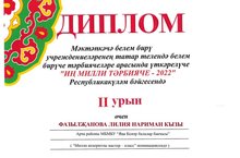 Хезмәттәшебез Фазылҗанова Л.Н.-ны "Иң милли тәрбияче-2022" республикакүләм бәйгедә 2 нче урын алуы белән котлыйбыз, яңа уңышлар телибез!