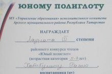 Воспитанница старшей группы нашего детского сада Хабибуллина Ралия стала лауреатом III степени районного конкурса чтецов "Юный полиглот". Поздравляем ее руководителя - воспитателя Гайнуллину Г.Ф. , желаем дальнейших успехов.