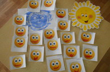 Икенче кечкенәләр төркеме балалары тәрбиячеләре Лилия Наримановна белән бергәләп елмаючы кояш ясадылар.Рәсем сәнгатенең кайбер серләрен ачтылар.Алар үзләре дә кояш кебек балкый, елмая иде. Бу елмаюларны алар бер-берсенә үләк иттеләр.