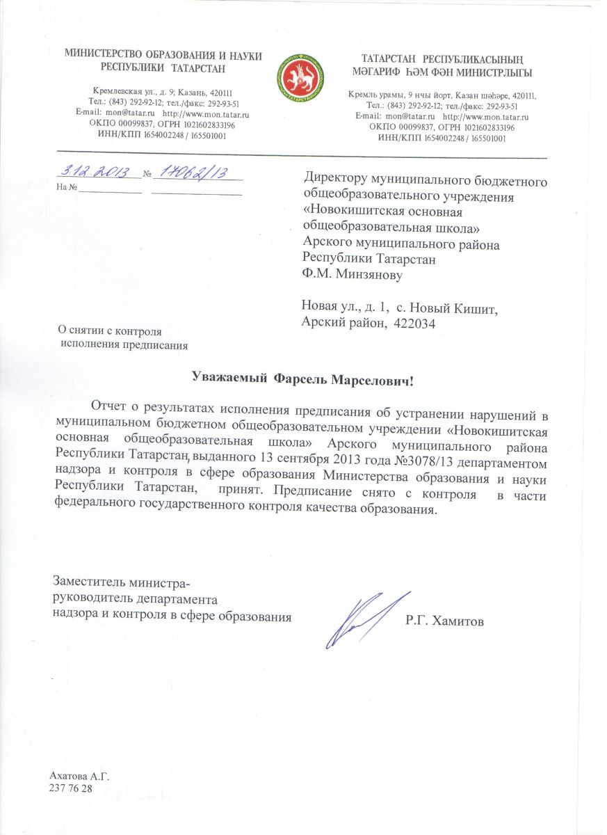 Отчет о результатах исполнения предписания об устронении нарушений муниципального бюджетного учреждения "Новокишитская ООШ" Арского муниципального района Республики Татарстан, 03.12.2013 №17062/13