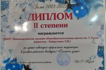 Диплом II степени 14.01.2022 Наша школа заняла 2 место за лучшее новогоднее оформление территории в рамках районного конкурса "Снежные узоры"