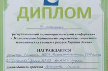 Конференция "Хартия Земли" 06.05.2019 В АСОШ №2 была проведена республиканская конференция по теме «Экологическая безопасность современных социально-экономических систем в ракурсе Хартии Земли». По итогам конференции учащиеся нашей школы были награждены Дипломами: Набиуллина Камиля (9класс), Арсаева Зухра (8 класс), Сабирова Азалия (8 класс), Гилязиева Гузель (7 класс). Поздравляем!