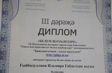 IX Дөньякүләм "Белем җәүһәрләре-2018" интернет-проектлар бәйгесе нәтиҗәсе 30.10.2018 29 нчы октябрь көнне Габдулла Кариев исемендәге Казан Татар дәүләт яшь тамашачы театрында IX Дөньякүләм "Белем җәүһәрләре – 2018" интернет-проектлар бәйгесенең җиңүчеләрен бүләкләү тантанасы үтте.Тантанага финалга чыккан 38 интернет-проект авторы чакырулы иде. Алар арасында Мөндеш башлангыч мәктәбенең башлангыч сыйныфлар укытучысы Гыйбадуллина Ильмира Габделхак кызы да бар иде. Ул “Башлангычым-гүзәл мизгелем” интернет-проект белән катнашып, III дәрәҗә диплом белән бүләкләнде. Ильмира Габделхак кызын әлеге зур уңышы белән ихлас күңелдән котлыйбыз!