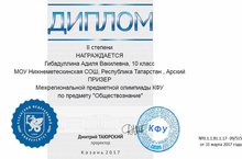 Казан федераль университеты үткәрә торган регионара предмет олимпиадаларында безнең мәктәп укучылары актив катнашалар. Олиvпиаданың беренче туры дистанцион үткәрелә. Дистанцион тур призерларыбыз ел да күп була. Бу уку елында КФУның үзенә барып, 2 турда катнашкан 10 класс укучысы Гыйбадуллина Әдилә җәмгыять белеме фәненнән 2 призлы урынга лаеклы булды. Котлыйбыз!