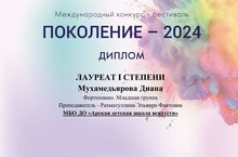 16 ноября в г.Альметьевск проходил Международный конкурс-фестиваль "Поколение - 2024", в котором приняла участие обучающая музыкального отделения Диана Мухамедьярова кл.преподавателя Рахматуллиной Э.Ф. и заняла достойное место. Поздравляем с победой и желаем дальнейших творческих успехов!
