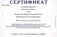 Балалар сәнгать мәктәбенең фортепиано бүлеге укучысы Гарифуллина Зәринәне "Тылсымлы тавышлар" Бөтенроссия конкурсының I дәрәҗәдәге дипломант дипломы белән котлыйбыз. Укытучы Мөхәммәдиева Дамира Камил кызы Рәхмәт хаты белән бүләкләнде.