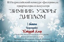 Поздравляем обучающегося музыкального отделения по специальности "классическая гитара" Детской школы искусств Котдусова Амира с дипломом I степени III Всероссийского конкурса-фестиваля "Зимние узоры" в г.Рязань Преподаватель Фахрутдинова А.Л. была отмечена Благодарственным письмом
