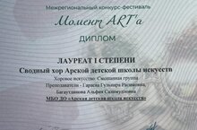 Арча балалар сәнгать мәктәбенең җыелма хоры Казанда узган Момент ART'a" Регионара бәйге-фестивалендә катнашып I дәрәҗә лауреат дипломына лаек булды. Җитәкчеләре Гәрәева Г.Р., Баһаветдинова А.С. -