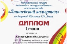 Поздравляем обучающуюся музыкального отделения (класс "скрипка") Детской школы искусств - Алмаеву Диану (преподаватель Валиуллина В.В. @valentinavv64 ), ставшую лауреатом I степени в Республиканском конкурсе вокального и инструментального исполнительства "Алишевский камертон", посвященный 100-летию Р.М. Яхина.
