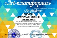 Арча балалар сәнгать мәктәбенең уен кораллары бүлеге укучысы Харисов Алмаз "Art-платформа" Халыкара бəйгесенең "Халык уен кораллары.Курай-соло" номинациясендә уңышлы чыгыш ясап (җитəкчесе Харисов Р.Р.) III дəрəҗə лауреат исеменә лаек булды.