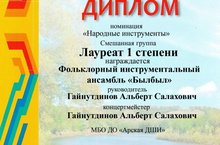 В номинации "Народные инструменты. Гитара" - Гайфутдинов Рустем - лауреат I степени, Ахтямов Ислам - лауреат II степени, Котдусов Амир - дипломант I степени, Шигабутдинов Риназ - дипломант II степени, Гарипов Мурат - дипломант II степени. Преподаватель Фахрутдинова Альмира Леонидовна была отмечена Благодарственным письмом. Фольклорный ансамбль "Былбыл"лауреат I степени. Преподаватель Гайнутдинов Альберт Салахович была отмечен Благодарственным письмом. Поздравляем! Молодцы!