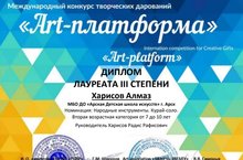 Поздравляем обучающегося народного отделения Детской школы искусств - Харисова Алмаза с дипломом лауреата III степени Международного конкурса "Аrt-платформа" (заочно) в г. Казань. Преподаватель Харисов Р.Р. был отмечен Благодарственным письмом