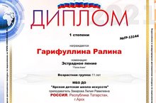 Поздравляем обучающуюся вокального отделения Детской школы искусств Гарифуллину Ралину (преподаватель Закирова Лилия Равилевна) с достойной победой во Всероссийском вокальном конкурсе "Голос России" (дистанционно) в г.Краснодар.