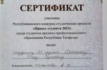 3нче курс студенты Прохоров Егор Татарстан Республикасы урта һөнәри белем бирү оешмалары студентлары арасында Республика студентлар проектлары конкурсында катнашучы сертификатына ия булды. -