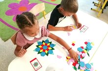 Ирекле эшчәнлектә балалар бик теләп "Танграм" уенын уйныйлар. Башта балалар үз фигураларын (мәсәлән, куянны) җыйдылар, аннары алар бер-берсе белән фигуралар алмаша башладылар һәм шул рәвешле күпчелек фигураларны үрнәк буенча җыярга өйрәнделәр. Бу кызыклы уен балаларны конструктив фикерләү һәм әйләнә-тирәне күзаллауга өйрәтә/ Дети с удовольствием играют в игру "Танграм" в свободной деятельности. Сначала они собирали свою фигурку (например, зайчика), затем они стали меняться друг с другом фигурками, и таким образом научились собирать большинство фигур по по образцу. Эта интересная и занимательная игра учит детей конструктивному мышлению и пространственному воображению.