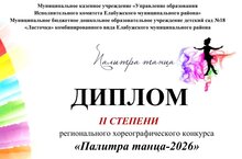 На базе МБДОУ детский сад №18 «Ласточка» комбинированного вида Елабужского муниципального района прошёл региональный хореографический конкурс «Палитра танца — 2026». Наши хореографические коллективы «Талисман» и «Звездочки» заняли 2 место. Мы поздравляем наших победителей и желаем им творческих успехов!