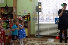К ребятам за помощью приехала кукла Маша из сказочного городка. У её друга Светофор Светофорыча перестали светиться сигналы светофора. Дети должны были, выполняя задания, помочь Светофор Светофорычу. Ребята вместе с воспитателем вспомнили, что такое правила дорожного движения и для чего они нужны. Отгадывали загадки, в стихотворной форме рассказали про дорожные знаки. Малыши узнали, что у них на дороге есть друг – светофор! Они с удовольствием поиграли в подвижную игру «Светофор» с флажками. На каждый цвет сделать правильное движение: красный - стоять, желтый – хлопать в ладоши, зелёный – шагать.