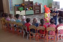 Детей под веселую музыку встретил Петрушка, который сразу окунул их в мир игр, музыки и танцев. Дети вместе с именинником принимали активное участие в веселых и подвижных играх, показали свою ловкость, смекалку. Они встали и окружили именинника и пели каравай столько раз сколько ему исполнилось лет. Одарили именинника пожеланиями и комплиментами, нарисовали и подарили на память картину, а также устроили салют из мыльных пузырей в честь дня рождения.